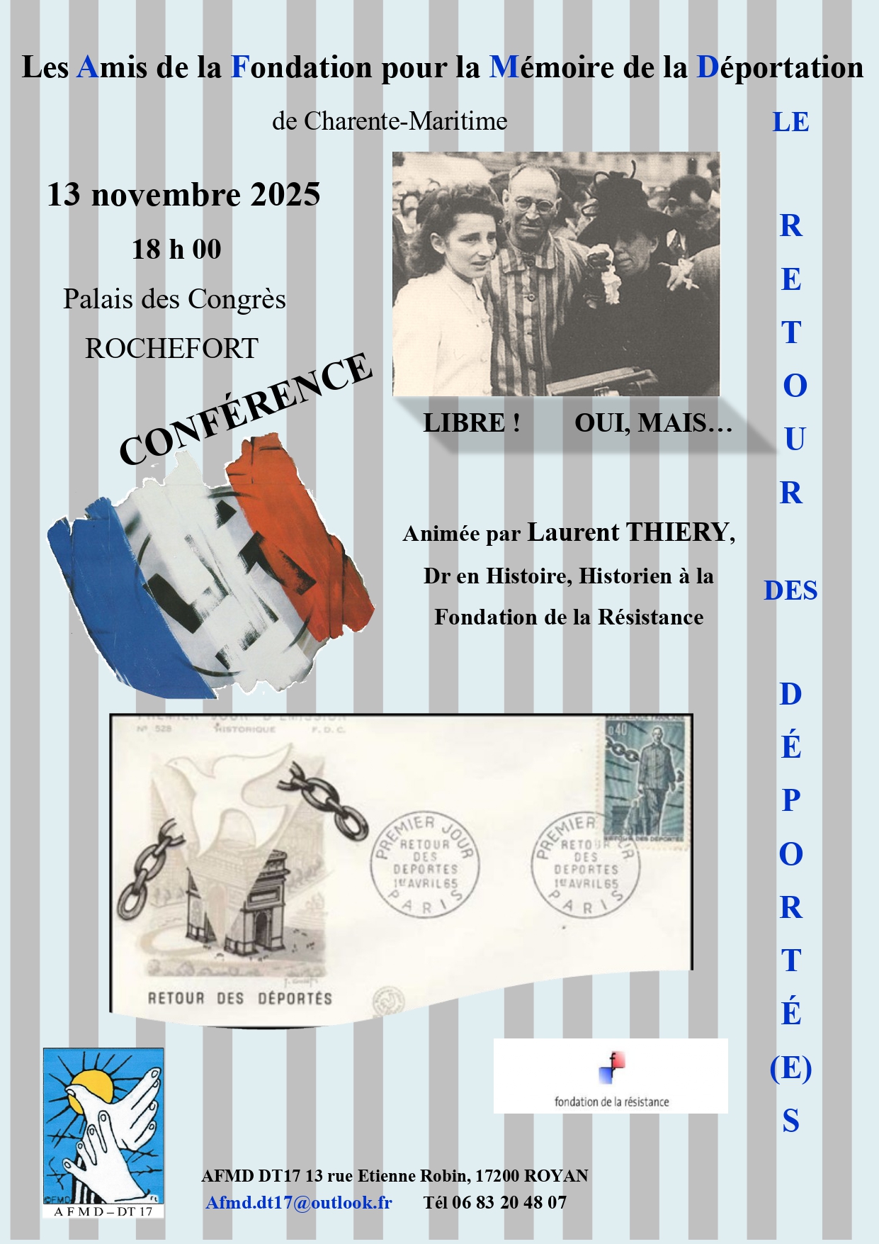 Les Amis de la Fondation pour la Mémoire de la Déportation de Charente-Maritime organise une conférence « Le Retour des déporté(e)s » animée par Laurent THIERY, Dr en Histoire, Historien à la Fondation de la Résistance Elle se déroulera le jeudi 13 novembre 2025 de 18h00 à 20h00 au Palais des Congrès de Rochefort. Le sujet porte…