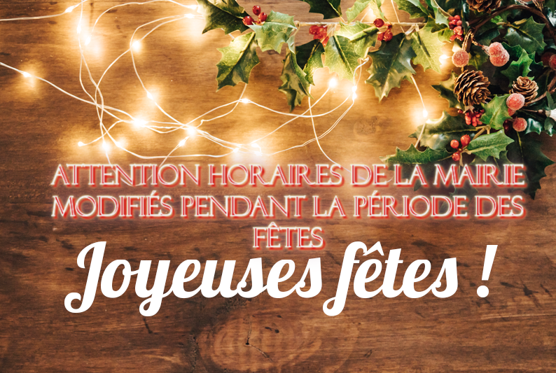 Horaires de la mairie pendant la période de fêtes : La mairie sera exceptionnellement fermée le vendredi 26 décembre 2025 Du 29 décembre 2025 au 4 janvier 2026 : La mairie sera ouverte uniquement le mardi 30 décembre de 9h00 à 17h30 (sauf entre 12h30 et 13h30) Réouverture de la mairie aux horaires habituels le…