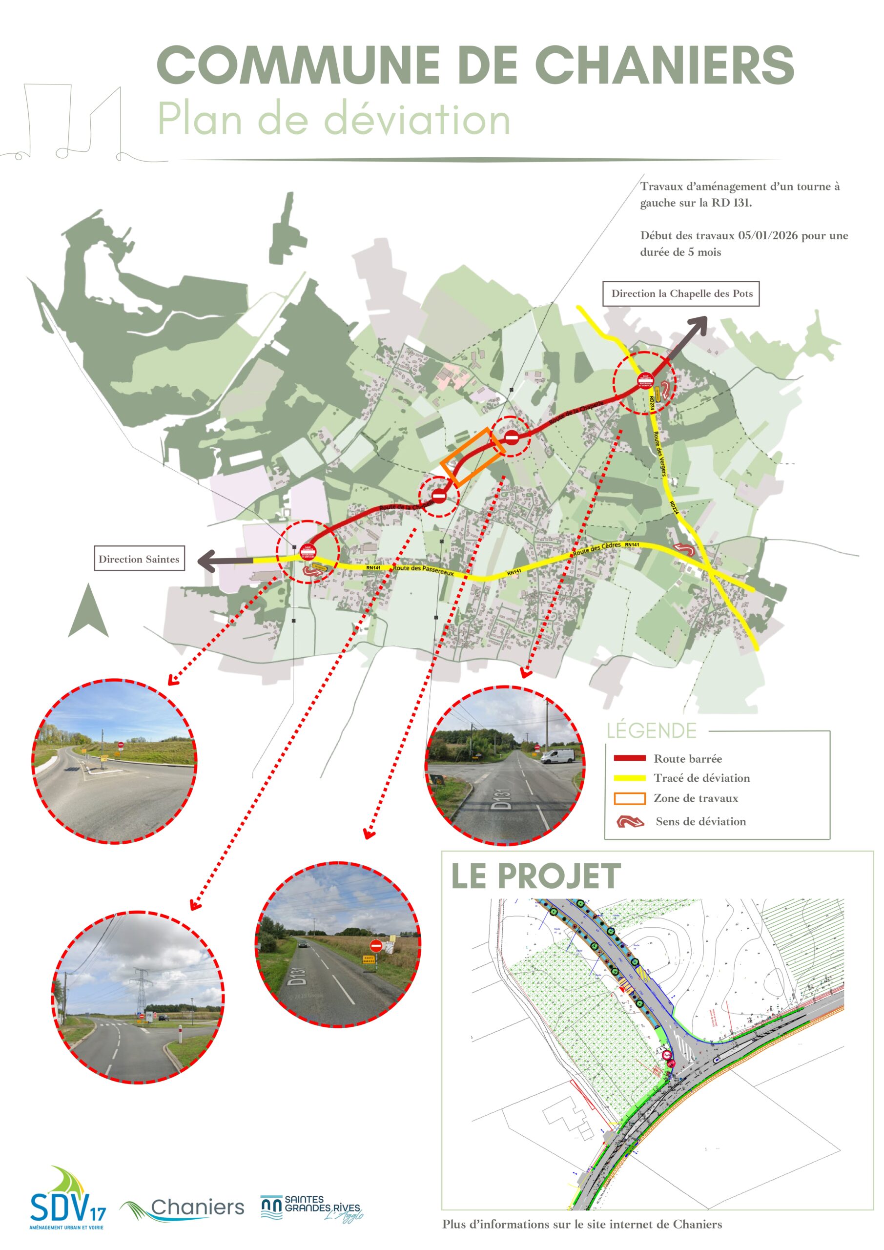 Vous trouverez le plan de déviation Route de La Chapelle pendant les travaux d’aménagement d’un tourne à gauche sur la RD 131 (commune de CHANIERS) à télécharger en PDF ci-dessous Début des travaux le 5 janvier 2026 pour une durée de 5 mois.