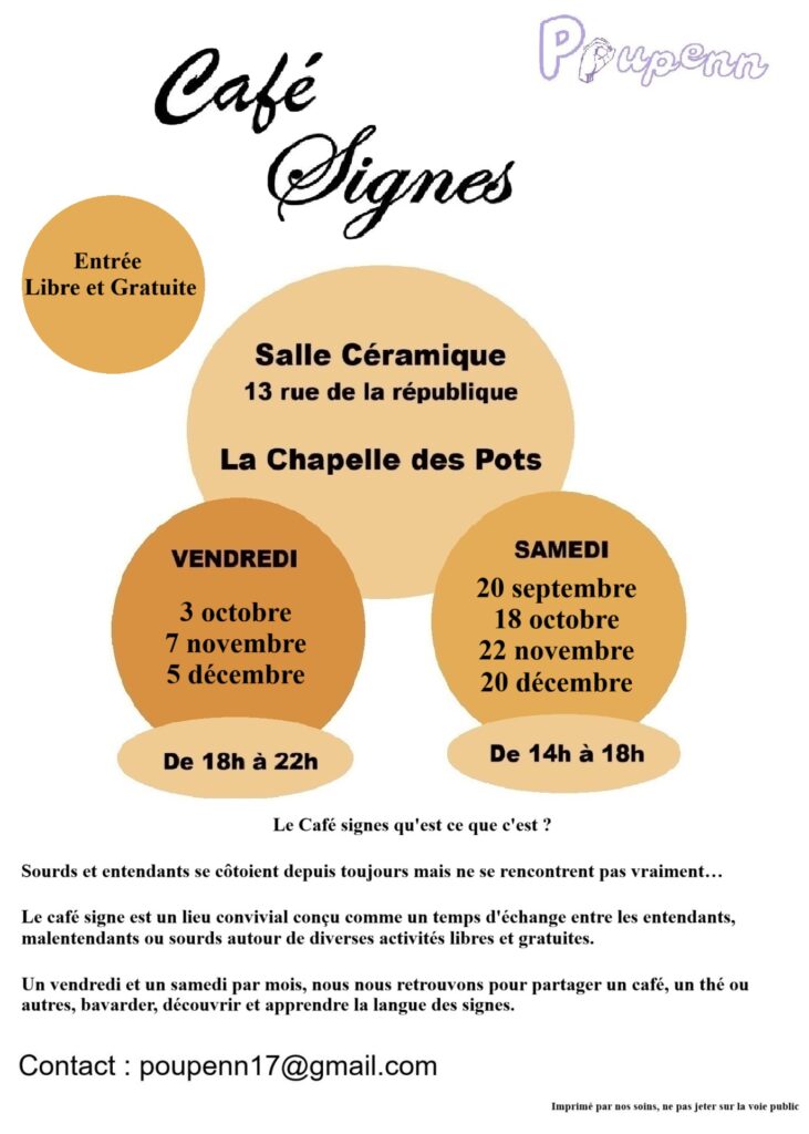 Le Café Signe est un lieu convivial conçu comme un temps d’échange entre les entendants, malentendants ou sourds autour de diverses activités libres et gratuites.