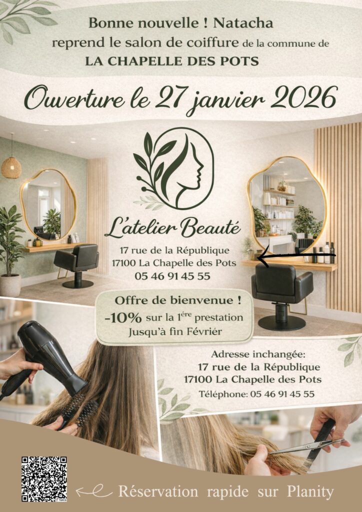Bonne nouvelle ! Natacha reprend le salon de coiffure de la commune de LA CHAPELLE DES POTS.