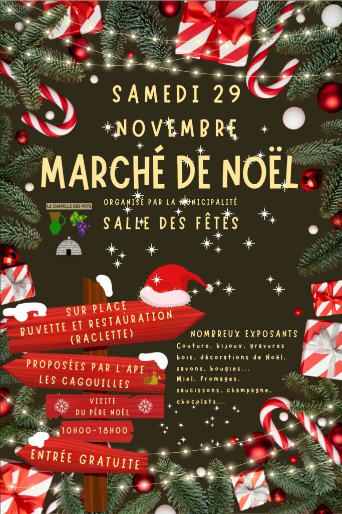 Marché de Noël Marché de noël à la salle des fêtes de la commune le samedi 29 novembre 2025 organisé par la municipalité + Ajouter à mon Agenda Google + iCal / Outlook export 00 jours 00 heures 00 minutes 00 secondes Date 29 Nov 2025 Heure Ajouter un jour Lieu salle des fêtes la Chapelles des Pots Catégorie Marché de Noël Organisateur Mairie Partagez cet événement novembre 2025 Nov 11 2025 Cérémonie du 11 novembre Monument aux morts Nov 29 2025 Marché de Noël salle des fêtes Pas d'événement actuellement programmé.